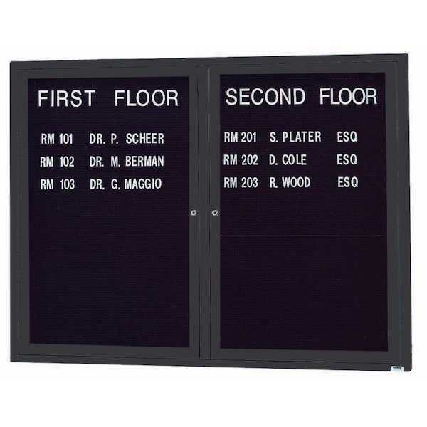 Outdoor Enclosed Aluminum Directory Boards are made of custom extruded parts engineered to provide accurate, durable and handsome cabinets. All corners are neatly mitered and assembled with Heavy duty reinforcements and fasteners. The black vinyl covered grooved rear panel designed to accommodate changeable letters with tabs spaced on 1/4" centers. Black Powder Coated Finish Size 36"Hx48"W 2 Doors