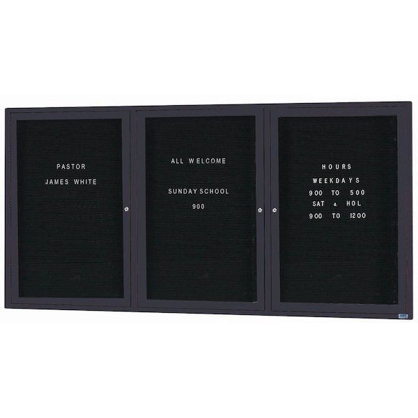 Outdoor Enclosed Aluminum Directory Boards are made of custom extruded parts engineered to provide accurate, durable and handsome cabinets. All corners are neatly mitered and assembled with Heavy duty reinforcements and fasteners. The black vinyl covered grooved rear panel designed to accommodate changeable letters with tabs spaced on 1/4" centers. Black Powder Coated Finish Size 36"Hx72"W 3 Doors