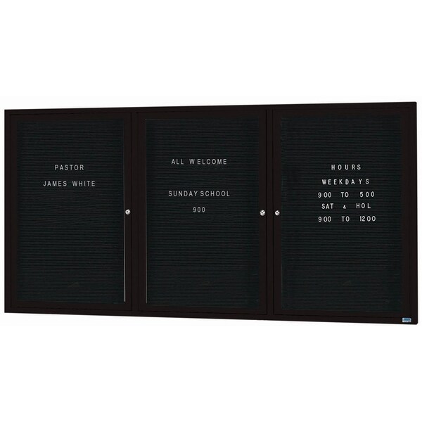 Outdoor Enclosed Aluminum Directory Boards are made of custom extruded parts engineered to provide accurate, durable and handsome cabinets. All corners are neatly mitered and assembled with Heavy duty reinforcements and fasteners. The black vinyl covered grooved rear panel designed to accommodate changeable letters with tabs spaced on 1/4" centers. Black Powder Coated Finish Size 48"Hx96"W 3 Doors