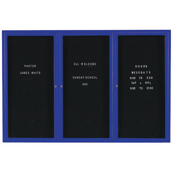 Outdoor Enclosed Aluminum Directory Boards are made of custom extruded parts engineered to provide accurate, durable and handsome cabinets. All corners are neatly mitered and assembled with Heavy duty reinforcements and fasteners. The black vinyl covered grooved rear panel designed to accommodate changeable letters with tabs spaced on 1/4" centers. Blue Powder Coated Finish Size 48"Hx72"W 3 Doors