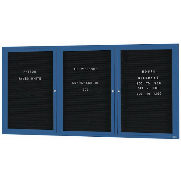 Outdoor Enclosed Aluminum Directory Boards are made of custom extruded parts engineered to provide accurate, durable and handsome cabinets. All corners are neatly mitered and assembled with Heavy duty reinforcements and fasteners. The black vinyl covered grooved rear panel designed to accommodate changeable letters with tabs spaced on 1/4" centers. Blue Powder Coated Finish Size 48"Hx96"W 3 Doors