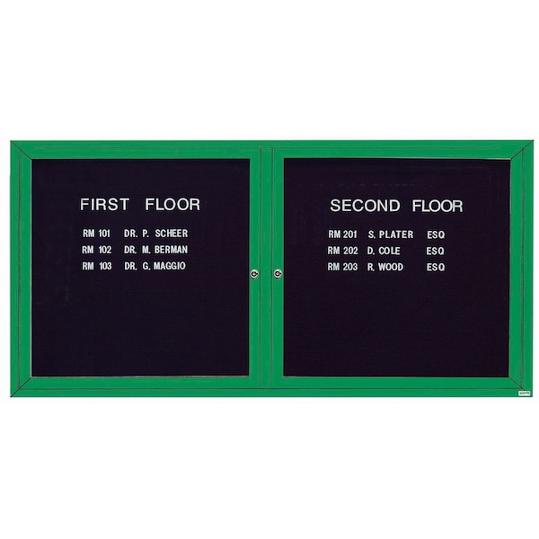 Outdoor Enclosed Aluminum Directory Boards are made of custom extruded parts engineered to provide accurate, durable and handsome cabinets. All corners are neatly mitered and assembled with Heavy duty reinforcements and fasteners. The black vinyl covered grooved rear panel designed to accommodate changeable letters with tabs spaced on 1/4" centers. Green Powder Coated Finish Size 36"Hx72"W 2 Doors