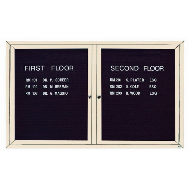 Outdoor Enclosed Aluminum Directory Boards are made of custom extruded parts engineered to provide accurate, durable and handsome cabinets. All corners are neatly mitered and assembled with Heavy duty reinforcements and fasteners. The black vinyl covered grooved rear panel designed to accommodate changeable letters with tabs spaced on 1/4" centers. Ivory Powder Coated Finish Size 36"Hx60"W 2 Doors