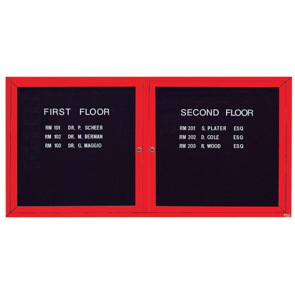 Outdoor Enclosed Aluminum Directory Boards are made of custom extruded parts engineered to provide accurate, durable and handsome cabinets. All corners are neatly mitered and assembled with Heavy duty reinforcements and fasteners. The black vinyl covered grooved rear panel designed to accommodate changeable letters with tabs spaced on 1/4" centers. Red Powder Coated Finish Size 36"Hx72"W 2 Doors