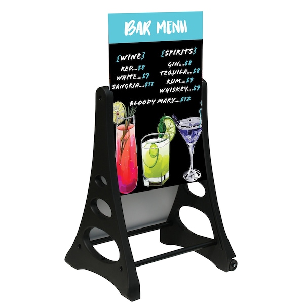 Roll A-Frame double sided sidewalk board poster holder frame. Holds any 36"H x 24"W Graphic Media up to 3/16" thick.