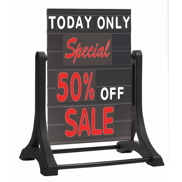 The Rocker double sided sidewalk sign draws attention to the message with the wind-generated rocking motion. Quickly update your promotions with ease with the durable high contrast changeable letterboard or markerboard options.Perfect for Restaurants, Retail Stores, Delis, Car Washes, Convenience Stores, Bagel and Sandwich Shops and more. The Rocker frameless double sided sidewalk sign with 7 line black changeable letterboard. Includes set of 354 characters. Letters are 4". Also includes Deluxe 8" Red Numbers, %, Sale and Special Insert