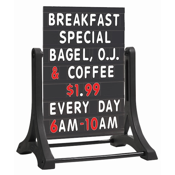 The Rocker double sided sidewalk sign draws attention to the message with the wind-generated rocking motion. Quickly update your promotions with ease with the durable high contrast changeable letterboard or markerboard options.Perfect for Restaurants, Retail Stores, Delis, Car Washes, Convenience Stores, Bagel and Sandwich Shops and more. The Rocker frameless double sided sidewalk sign with 7 line black changeable letterboard. Includes set of 354 characters. Letters are 4".