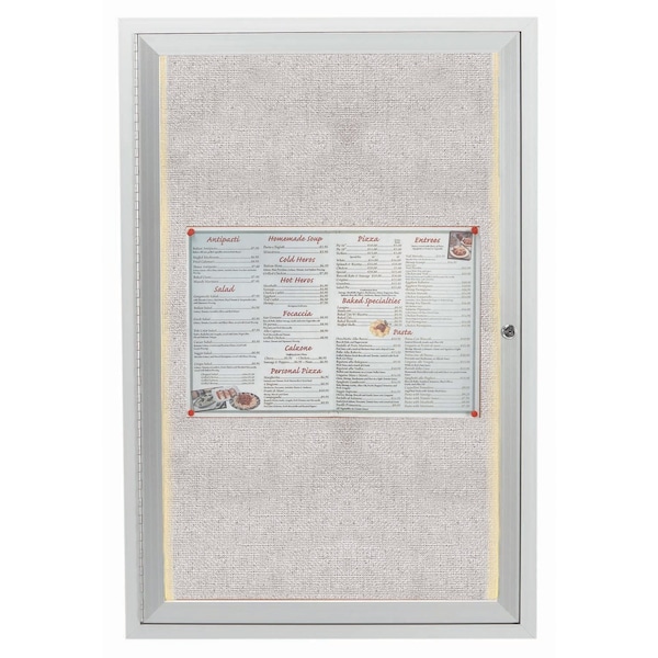 Illuminated Outdoor Enclosed Aluminum Bulletin Boards are made of custom extruded parts engineered to provide accurate, durable and handsome cabinets. All corners are neatly mitered and assembled with Heavy duty reinforcements and fasteners. Units are weatherized. Back panel is an attractive standard vinyl. Finish Clear Satin Anodized Size 24"Hx18"W 1 Door
