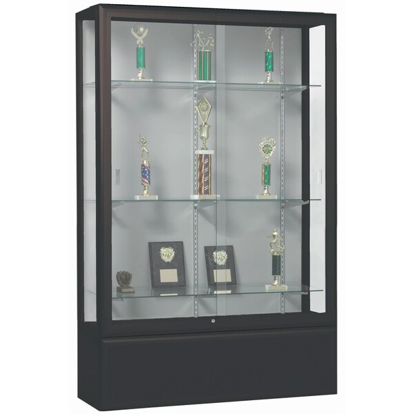 Waterfall Style Display Case features full radius edge frame with adjustable 1/4" tempered glass shelves. 1/4" Tempered Glass Sliding doors with inline lock. LED Lighting. Smooth Black Powder Coat Finish