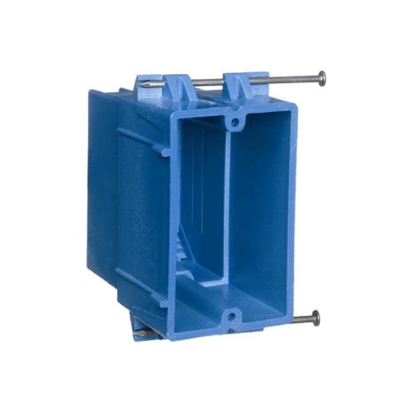 Single Gang New Work With Captive Nails, Super Blue Hard Body Wiring Box, 22 CUIN Capacity, Rigid, Resists Flexing Holds Its Shape Even Under The Worst Conditions, Super Tough, Will Not Crack Or Break Like Fiberglass, Super Integral Cable Clamps, Eliminates Metal Clamps Screws