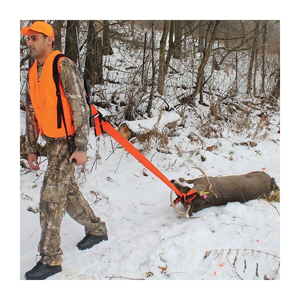 Deer drag harness that goes over both shoulders. Comes with an adjustable drag strap too. Is easy to use, comfortable and makes it much easier to drag deer than traditional drags. Strapping is super-durable and is 3" ( 7.62 cm ) wide.