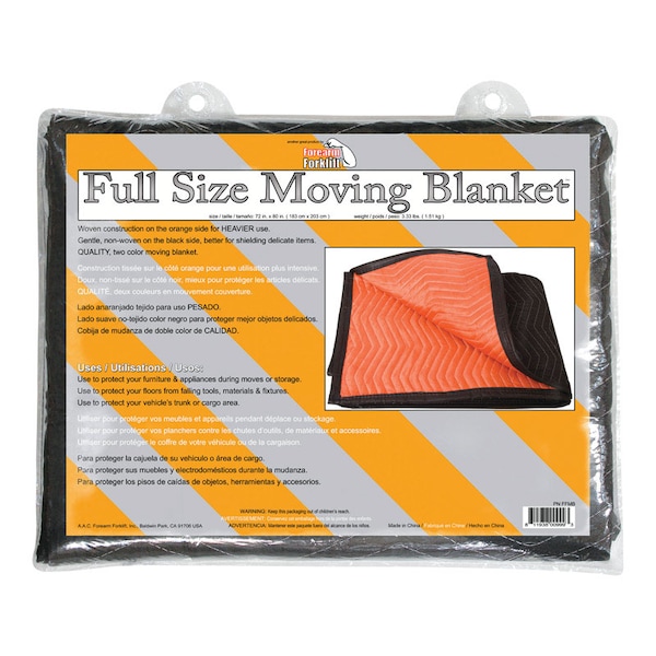 Full size moving blanket woven construction on the blaze orange side for heavier use, gentle non-woven black side for shielding delicate items. Protects floors, appliances or furniture during moves or storage. Also protects car trunk cargo areas.