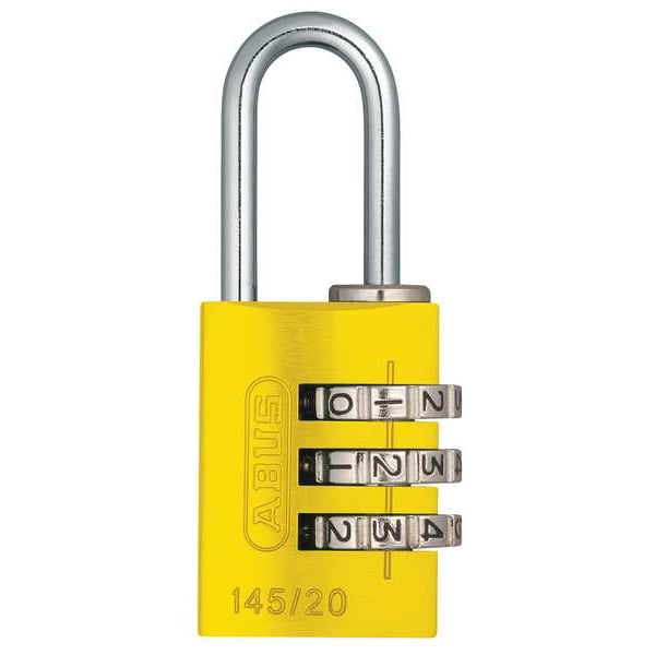 Combination Padlock, Body Finish Anodized, Body Height 1 1/8 in, Body Material Aluminum, Body Thickness 17/32 in, Body Width 57/64 in, Body Color Yellow, Dial Location Side, For Use With Cabinets, Office Environments and Equipment, School, Employee and Athletic Lockers, Storage Lockers, Key Control No, Key Type Combination, Number of Bumpers 0, Number of Dials 3, Resettable Resettable, Shackle Dia. 1/8 in, Shackle Height 7/8 in, Shackle Material Steel, Shackle Width 5/16 in