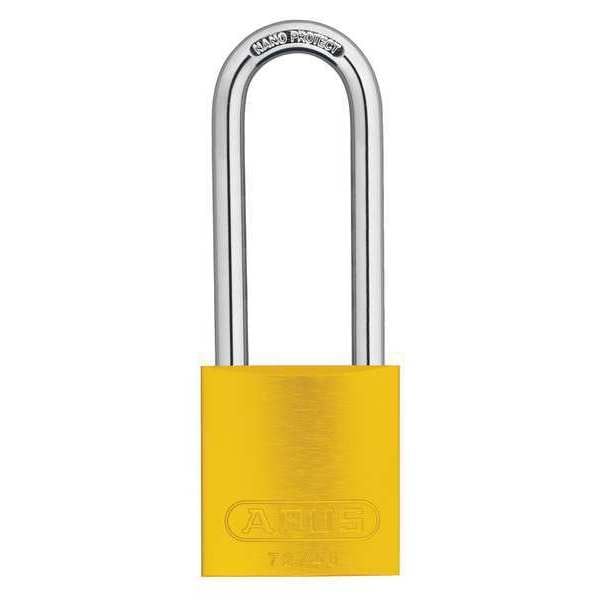 Keyed Padlock, Body Color Yellow, Body Height 1 5/8 in, Body Material Aluminum, Body Thickness 3/4 in, Body Width 1 1/2 in, Header None/No Header, Key Type Keyed Different, Shackle Diameter 1/4 in, Shackle Height 3 in, Shackle Material Hardened Steel, Shackle Type Open, Width Across Shackle 3/4 in, Body Shape Rectangular, Control Key Registration Required No, Includes Nickel Plated Brass Key, Package Quantity 6