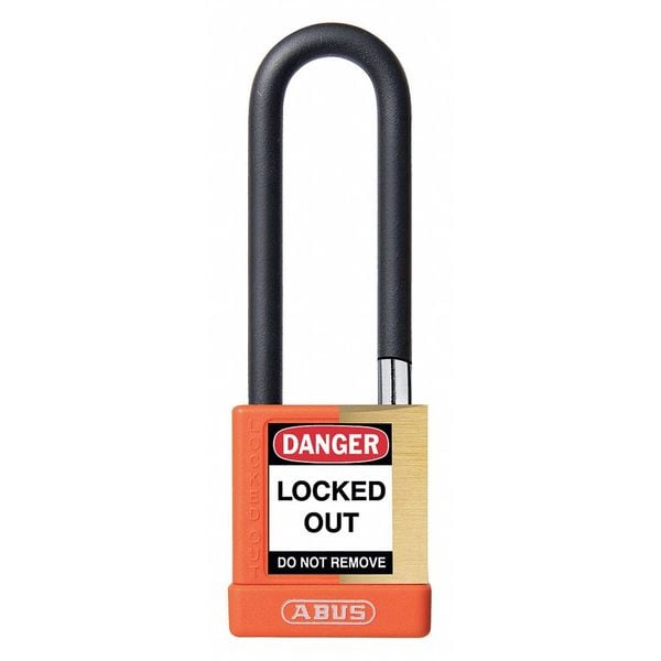 Keyed Padlock, Body Color Orange, Body Height 1 3/4 in, Body Material Brass, Body Thickness 3/4 in, Body Width 2 in, Header None/No Header, Key Type Keyed Alike, Non-Removable Key No, Shackle Diameter 1/4 in, Shackle Height 3 in, Shackle Material Hardened Steel, Shackle Type Open, Width Across Shackle 3/4 in, Body Material Coating Powder Coated, Body Shape Rectangular, Control Key Registration Required Yes, Includes (2) Keys