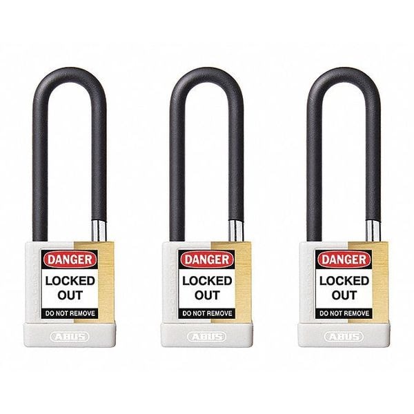 Keyed Padlock, Body Color White, Body Height 1 3/4 in, Body Material Brass, Body Thickness 3/4 in, Body Width 2 in, Header None/No Header, Key Type Keyed Alike, Non-Removable Key No, Shackle Diameter 1/4 in, Shackle Height 3 in, Shackle Material Hardened Steel, Shackle Type Open, Width Across Shackle 3/4 in, Body Material Coating Powder Coated, Body Shape Rectangular, Control Key Registration Required Yes, Includes (2) Keys, Package Quantity 3