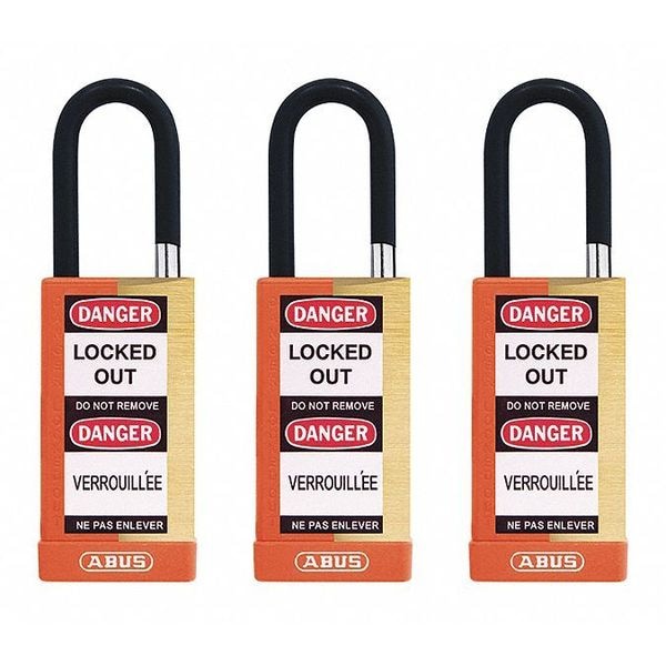 Keyed Padlock, Body Color Orange, Body Height 3 in, Body Material Brass, Body Thickness 3/4 in, Body Width 2 in, Header None/No Header, Key Type Keyed Alike, Non-Removable Key No, Shackle Diameter 1/4 in, Shackle Height 1 1/2 in, Shackle Material Hardened Steel, Shackle Type Open, Width Across Shackle 3/4 in, Body Material Coating Powder Coated, Body Shape Rectangular, Control Key Registration Required Yes, Includes (2) Keys, Package Quantity 3