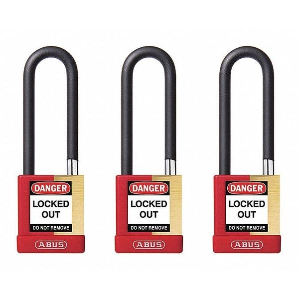Keyed Padlock, Body Color Red, Body Height 1 3/4 in, Body Material Brass, Body Thickness 3/4 in, Body Width 2 in, Header None/No Header, Key Type Keyed Different, Non-Removable Key No, Shackle Diameter 1/4 in, Shackle Height 3 in, Shackle Material Hardened Steel, Shackle Type Open, Width Across Shackle 3/4 in, Body Material Coating Powder Coated, Body Shape Rectangular, Control Key Registration Required Yes, Includes (2) Keys, Package Quantity 3