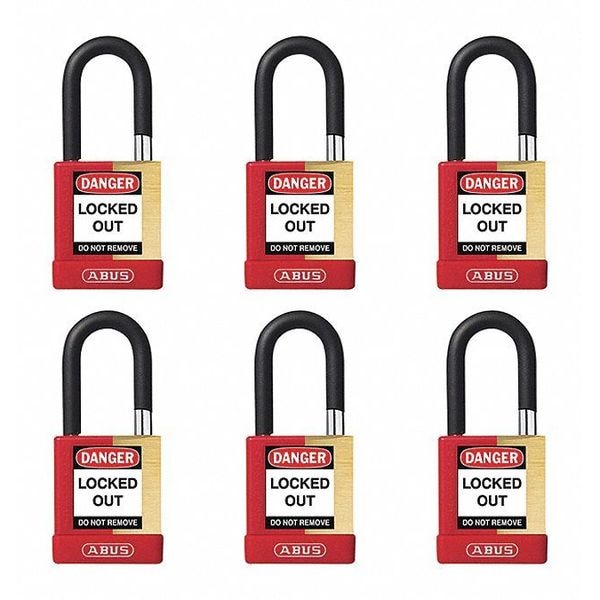 Keyed Padlock, Body Color Red, Body Height 1 3/4 in, Body Material Brass, Body Thickness 3/4 in, Body Width 2 in, Header None/No Header, Key Type Keyed Alike, Non-Removable Key No, Shackle Diameter 1/4 in, Shackle Height 1 1/2 in, Shackle Material Hardened Steel, Shackle Type Open, Width Across Shackle 3/4 in, Body Material Coating Powder Coated, Body Shape Rectangular, Control Key Registration Required Yes, Includes (2) Keys, Package Quantity 6
