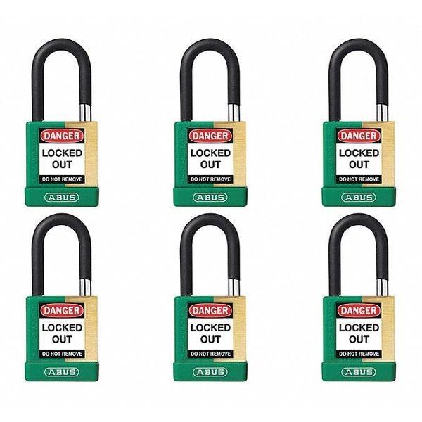 Keyed Padlock, Body Color Green, Body Height 1 3/4 in, Body Material Brass, Body Thickness 3/4 in, Body Width 2 in, Header None/No Header, Key Type Keyed Alike, Non-Removable Key No, Shackle Diameter 1/4 in, Shackle Height 1 1/2 in, Shackle Material Hardened Steel, Shackle Type Open, Width Across Shackle 3/4 in, Body Material Coating Powder Coated, Body Shape Rectangular, Control Key Registration Required Yes, Includes (2) Keys, Package Quantity 6