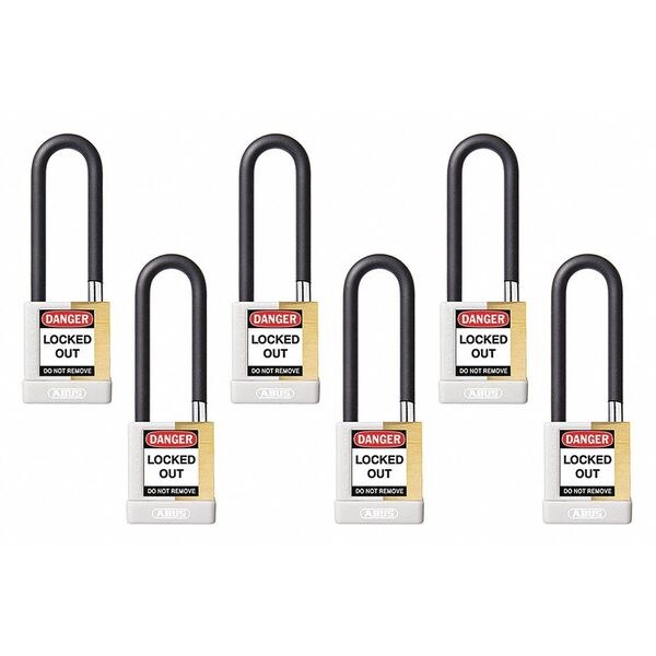 Keyed Padlock, Body Color White, Body Height 1 3/4 in, Body Material Brass, Body Thickness 3/4 in, Body Width 2 in, Header None/No Header, Key Type Keyed Alike, Non-Removable Key No, Shackle Diameter 1/4 in, Shackle Height 3 in, Shackle Material Hardened Steel, Shackle Type Open, Width Across Shackle 3/4 in, Body Material Coating Powder Coated, Body Shape Rectangular, Control Key Registration Required Yes, Includes (2) Keys, Package Quantity 6