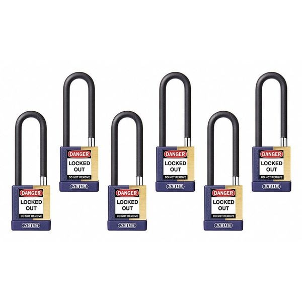 Keyed Padlock, Body Color Purple, Body Height 1 3/4 in, Body Material Brass, Body Thickness 3/4 in, Body Width 2 in, Header None/No Header, Key Type Keyed Different, Non-Removable Key No, Shackle Diameter 1/4 in, Shackle Height 3 in, Shackle Material Hardened Steel, Shackle Type Open, Width Across Shackle 3/4 in, Body Material Coating Powder Coated, Body Shape Rectangular, Control Key Registration Required Yes, Includes (6) Keys, Package Quantity 6