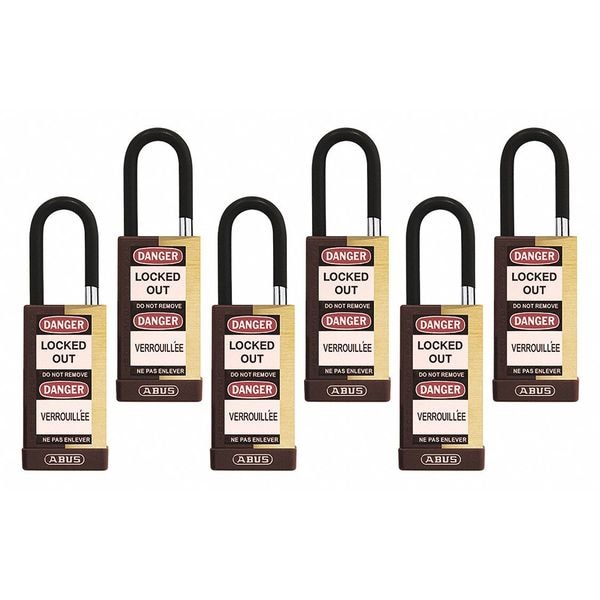Keyed Padlock, Body Color Brown, Body Height 3 in, Body Material Brass, Body Thickness 3/4 in, Body Width 2 in, Header None/No Header, Key Type Keyed Different, Non-Removable Key No, Shackle Diameter 1/4 in, Shackle Height 1 1/2 in, Shackle Material Hardened Steel, Shackle Type Open, Width Across Shackle 3/4 in, Body Material Coating Powder Coated, Body Shape Rectangular, Control Key Registration Required Yes, Includes (2) Keys, Package Quantity 6