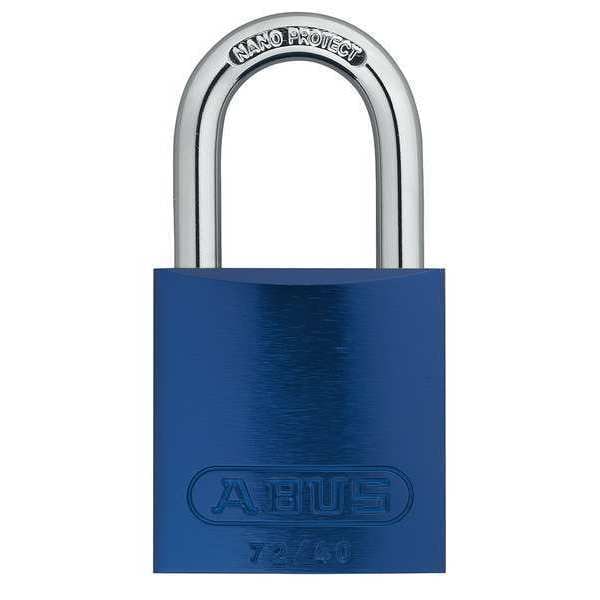 Lockout Padlock, Body Color Blue, Body Height 1 1/2 in, Body Material Aluminum, Body Thickness 11/16 in, Body Width 1 1/2 in, Header None/No Header, Horizontal Shackle Clearance 3/4 in, Key Type Keyed Different, Non-Removable Key Yes, Resistance Properties Corrosion Resistant, Heat Resistant, Shackle Diameter 1/4 in, Shackle Height 1 in, Shackle Material Hardened Steel, Shackle Type Open, Vertical Shackle Clearance 1 1/16 in, Width Across Shackle 13/16 in, Body Material Coating Anodized
