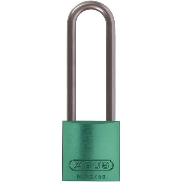 Lockout Padlock, Body Color Green, Body Height 1 1/2 in, Body Material Aluminum, Body Thickness 3/4 in, Body Width 1 9/16 in, Header None/No Header, Horizontal Shackle Clearance 3/4 in, Key Type Keyed Different, Non-Removable Key Yes, Resistance Properties Corrosion Resistant, Heat Resistant, Shackle Diameter 1/4 in, Shackle Height 3 in, Shackle Material Hardened Steel, Shackle Type Extended, Vertical Shackle Clearance 2 15/16 in, Width Across Shackle 13/16 in, Body Material Coating Anodized