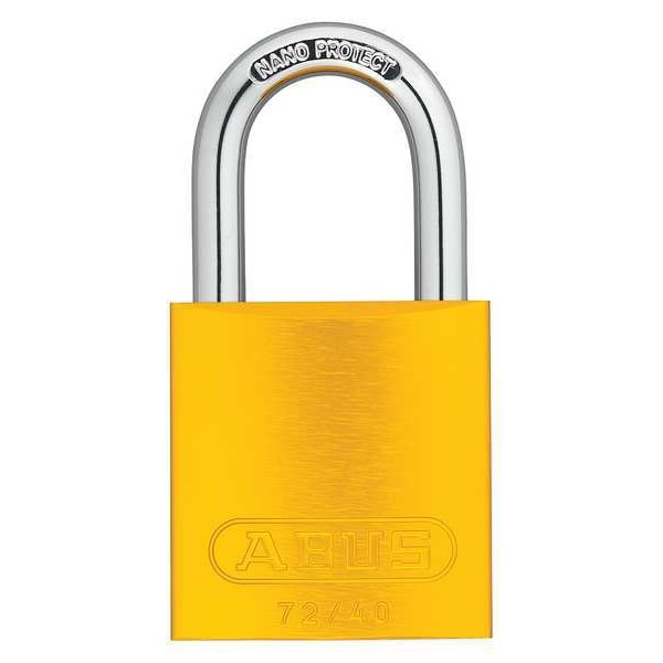 Lockout Padlock, Body Color Yellow, Body Height 1 1/2 in, Body Material Aluminum, Body Thickness 3/4 in, Body Width 1 9/16 in, Header None/No Header, Horizontal Shackle Clearance 3/4 in, Key Type Keyed Different, Non-Removable Key Yes, Resistance Properties Corrosion Resistant, Heat Resistant, Shackle Diameter 1/4 in, Shackle Height 1 in, Shackle Material Hardened Steel, Shackle Type Open, Vertical Shackle Clearance 1 1/16 in, Width Across Shackle 13/16 in, Body Material Coating Anodized