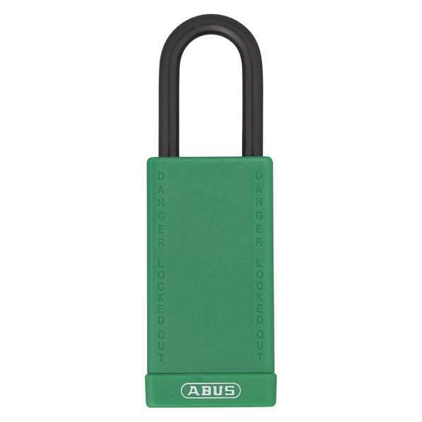 Lockout Padlock, Body Color Green, Body Height 3 in, Body Material Plastic-Covered Aluminum, Body Thickness 13/16 in, Body Width 1 9/16 in, Header Danger, Horizontal Shackle Clearance 3/4 in, Key Type Keyed Different, Non-Removable Key Yes, Resistance Properties Corrosion Resistant, Tamper Resistant, Shackle Diameter 1/4 in, Shackle Height 1 1/2 in, Shackle Material Steel, Shackle Type Open, Vertical Shackle Clearance 1 1/2 in, Width Across Shackle 3/4 in, Bumper Color Green