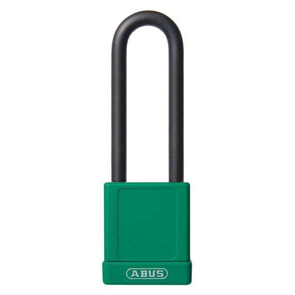 Lockout Padlock, Body Color Green, Body Height 1 3/4 in, Body Material Plastic-Covered Aluminum, Body Thickness 13/16 in, Body Width 1 9/16 in, Header None/No Header, Horizontal Shackle Clearance 3/4 in, Key Type Keyed Different, Non-Removable Key Yes, Resistance Properties Corrosion Resistant, Tamper Resistant, Shackle Diameter 5/16 in, Shackle Height 3 in, Shackle Material Steel, Shackle Type Open, Vertical Shackle Clearance 2 15/16 in, Width Across Shackle 3/4 in, Bumper Color Green