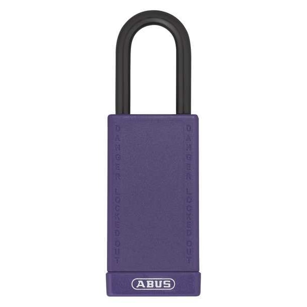 Lockout Padlock, Body Color Purple, Body Height 3 in, Body Material Plastic-Covered Aluminum, Body Thickness 13/16 in, Body Width 1 9/16 in, Header Danger, Horizontal Shackle Clearance 3/4 in, Key Type Keyed Different, Non-Removable Key Yes, Resistance Properties Corrosion Resistant, Tamper Resistant, Shackle Diameter 1/4 in, Shackle Height 1 1/2 in, Shackle Material Steel, Shackle Type Open, Vertical Shackle Clearance 1 1/2 in, Width Across Shackle 3/4 in, Bumper Color Purple