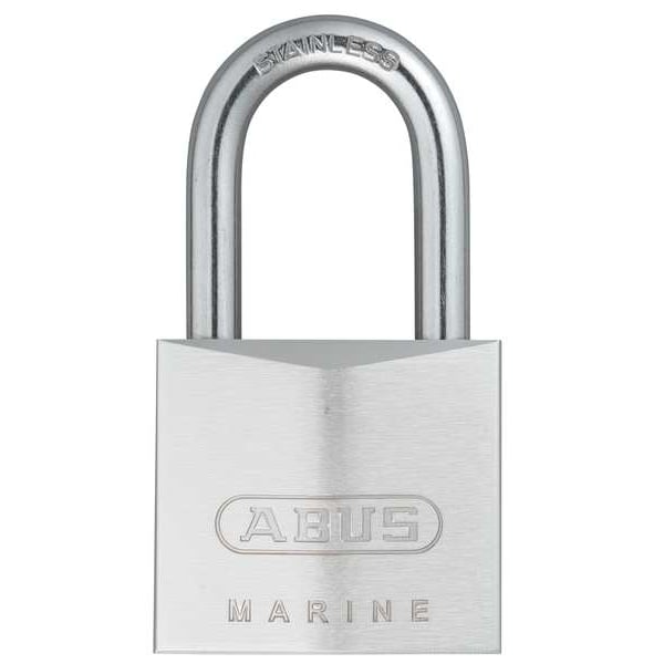 Padlock, Shackle Dia. 1/4 in, Shackle Height 1 1/2 in, Shackle Width 27/32 in, Shackle Material Stainless Steel, Body Height 1 25/64 in, Body Width 1 9/16 in, Body Thickness 5/8 in, Body Material Brass, Number of Bumpers 0, Number of Pins 8 Pin, Key Type Different, Control Key Registration Required No, Body Color Brushed Silver, Keyway Type Abus, Weather Resistant Yes, High Security Yes, Interchangeable Core No, Padlock Body Shape Rectangular, Rekeyable Yes, Shackle Type Long Shackle