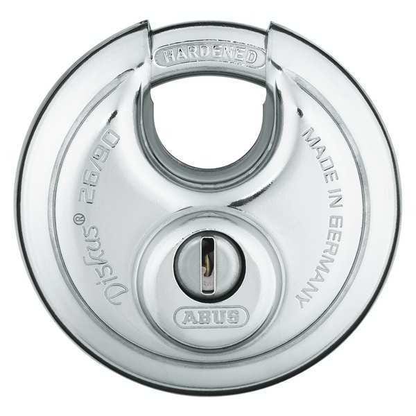 Padlock, Shackle Dia. 15/32 in, Shackle Height 5/8 in, Shackle Width 1 in, Shackle Material Steel, Body Height 3 35/64 in, Body Width 3 35/64 in, Body Thickness 1 9/64 in, Body Material Stainless Steel, Number of Bumpers 0, Number of Pins 6 Pin, Key Type Different, Body Color Silver, Body Dia. 3 3/4 in, Keyway Type Abus, Weather Resistant Yes, High Security Yes, Interchangeable Core No, Padlock Body Shape Disc, Rekeyable No, Shackle Type Covered Shackle