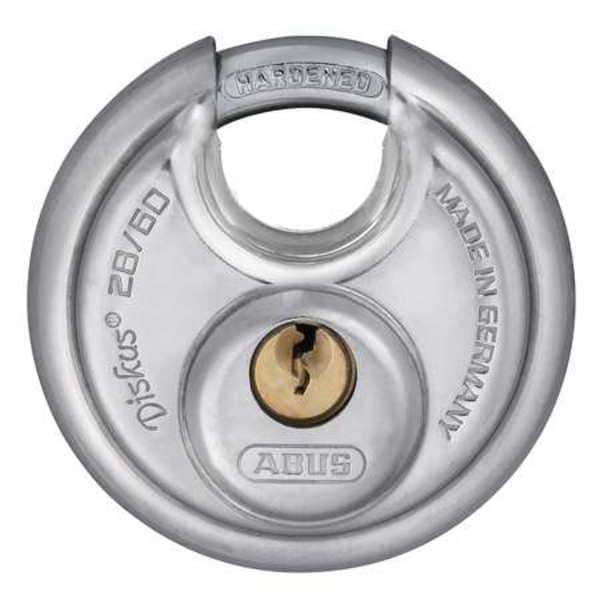 Padlock, Shackle Dia. 5/16 in, Shackle Height 1/2 in, Shackle Width 11/16 in, Shackle Material Steel, Body Height 2 23/64 in, Body Width 2 23/64 in, Body Thickness 1 1/32 in, Body Material Stainless Steel, Number of Bumpers 0, Number of Pins 4 Pin, Key Type Different, For Use With Hasps, Storage Units, or Chains, Body Color Silver, Body Dia. 2 3/8 in, Keyway Type Abus, Weather Resistant Yes, High Security No, Interchangeable Core No, Padlock Body Shape Disc, Rekeyable No