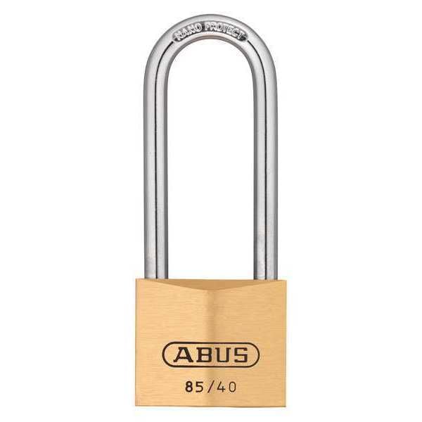Padlock, Shackle Dia. 1/4 in, Shackle Height 2 1/2 in, Shackle Width 15/16 in, Shackle Material Steel, Body Height 1 19/64 in, Body Width 1 37/64 in, Body Thickness 5/8 in, Body Material Brass, Number of Bumpers 0, Number of Pins 5 Pin, Key Type Different, Master, Control Key Registration Required No, Opens with Key No. 403, For Use With 85/40 Series Master Key, Body Color Brass, Keyway Type Abus, Weather Resistant Yes, High Security No, Interchangeable Core No, Padlock Body Shape Rectangular