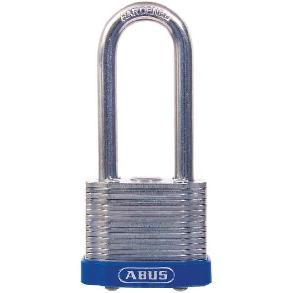 Padlock, Shackle Dia. 17/64 in, Shackle Height 2 in, Shackle Width 13/16 in, Shackle Material Steel, Body Height 1 3/16 in, Body Width 1 47/64 in, Body Thickness 1 1/32 in, Body Material Recycled Steel, Number of Bumpers 1, Number of Pins 4 Pin, 5 Pin, Key Type Different, Master, Control Key Registration Required No, Opens with Key No. 195, For Use With 41 Series Master Key, Body Color Blue, Body Finish Laminated, Keyway Type Abus, Weather Resistant No, High Security Yes, Interchangeable Core No