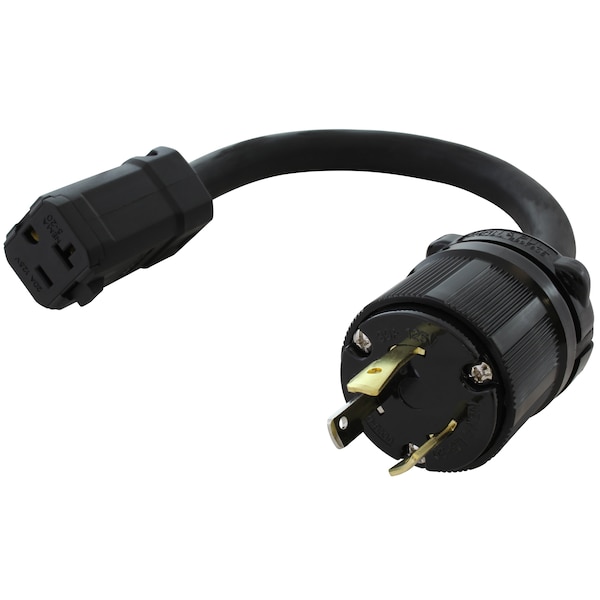 This AC WORKS brand locking adapter cord L530520-012 is used with transfer switches, generators, and industrial construction. It is a NEMA L5-30 male plug to a NEMA 5-20 female connector. The cable is an SOOW, 10/3, 30 Amp, copper wire with a 600 Volt rubber jacket staying flexible in cold weather. This adapter cord is 1ft long.