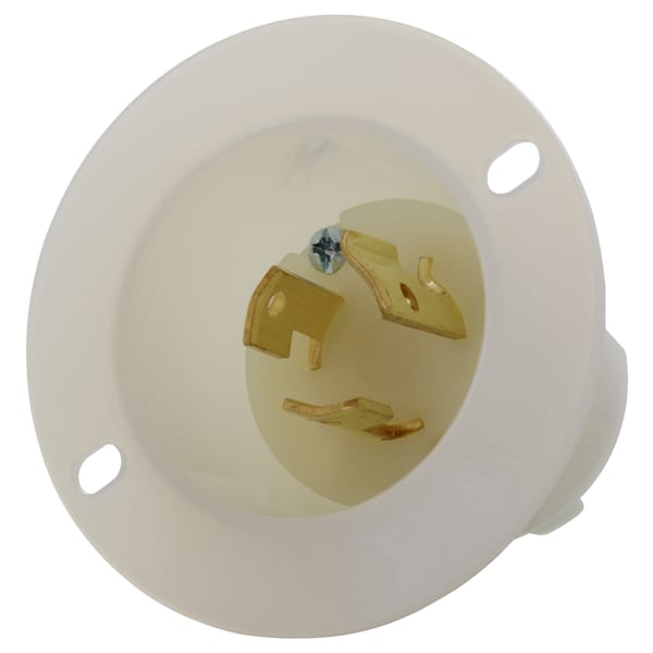 This AC WORKS brand inlet wiring device is a heavy-duty power input connection device. The L6-15 inlet is used for an industrial and commercial grade flange inlet. This inlet works with 12 or 10 AWG American Wire Gauge copper wire and is commonly used for industrial equipment.