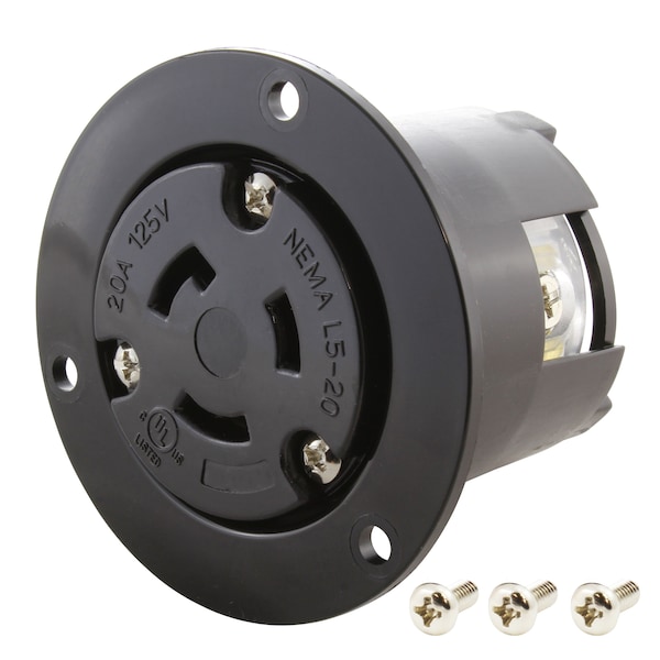 Flanged Locking Inlet, L5-20R, 20 A, 125V AC, Screw Terminals, Black