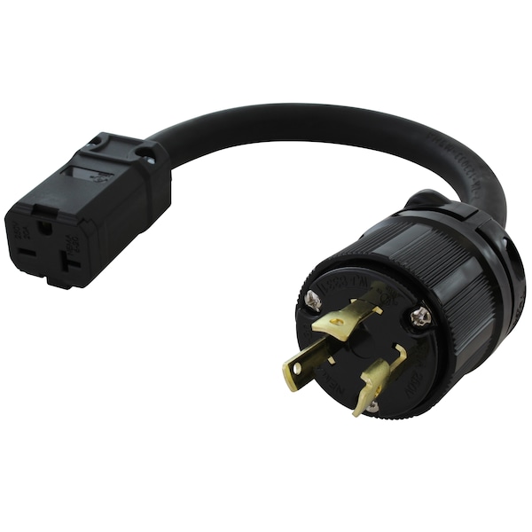 This AC WORKS brand locking outlet adapter L630620-012 is very durable. It is a NEMA L6-30P to NEMA 6-20R. The NEMA L6-30P is a 30 Amp, 250 Volt, 3-prong locking male plug. The NEMA 6-20R is a 15/20 Amp, 250 Volt, female connector. The cable is an SOOW, 10/3, 600 Volt jacket with a 30 Amp copper wire. The maximum operating power is 5000 Watts.