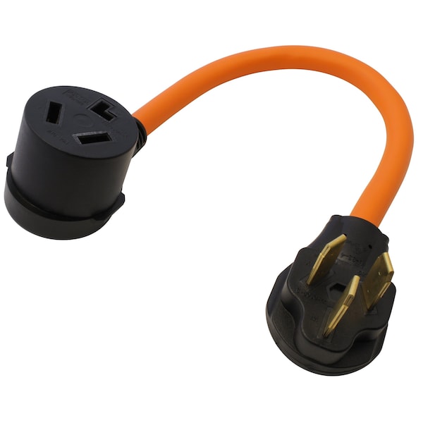 This AC WORKS brand adapter S10501030-018 is very durable with a flexible design. It is a NEMA 10-50P to a NEMA 10-30R. The NEMA 10-50P is a 50 Amp, 250 Volt, 3-prong male plug. The NEMA 10-30R is a 30 Amp, 250 Volt, 3-prong dryer outlet female connection. The product is heavy-duty STW 10/3 30-Amp Copper Wire with 600-Volt Jacket.