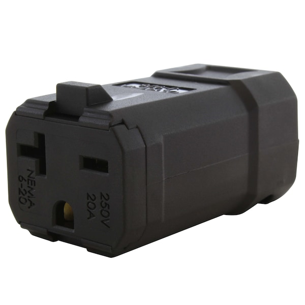 This AC WORKS brand, solid industrial grade wiring device is made of very durable construction able to withstand impacts, chemicals, and weather. It is a NEMA 6-20R, 20 Amp, 250 Volt straight-blade female connector. This product features a strain relief structure with SJT, SJO, SOO, STW, 12/3, 14/3, 16/3, and 18/3 cable specifications.