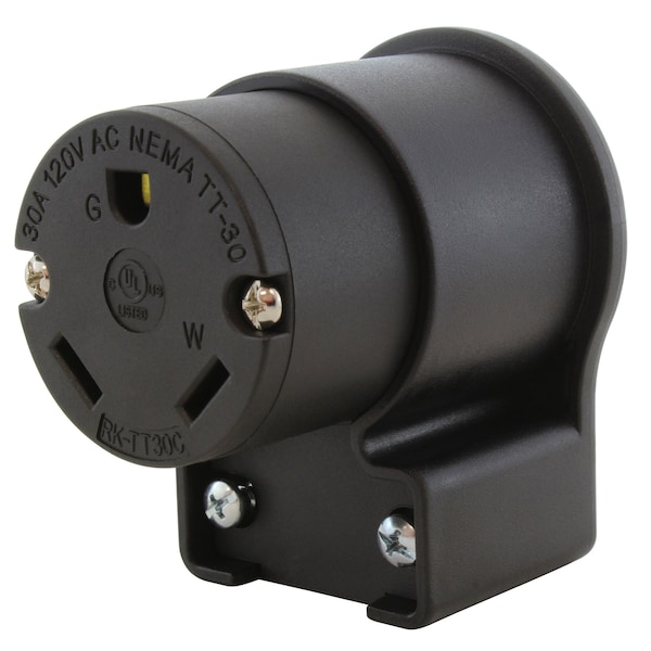 This AC WORKS brand, solid industrial grade wiring device ASETT30R is made of very durable construction able to withstand impacts, chemicals, and weather. It is a NEMA TT-30R, 30 Amp, 125 Volt straight-blade RV connector. This product features a strain relief structure with SJT, SJO, SOO, STW, and 10/3 cable specifications.