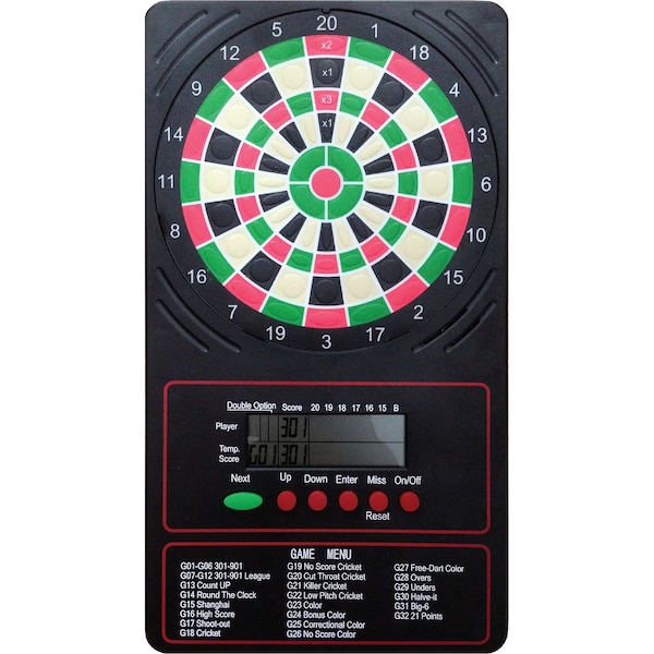 This touch pad dart scorer is a must for any basement rec room. The unit is easy to use: Simply touch the segment where your dart hit, and the device automatically calculates your score for one of 18 game types, including Count Up, Count Down, League 301, Round the Clock, Hi-Score, Shoot Out, and many more. The scores are a breeze to follow thanks to the LCD display, which rotates the scores for up to eight players. Dart fans will love the variety of extra features, including voice prompts for the next player, four cricket games, single in/out and double in/out functions, player rankings, and a sleep mode. The electronic scorer, which mounts easily on the wall, runs on either AC power or three AA batteries not included and measures 6 by 10.5 by 0.75 inches W x H x D.
