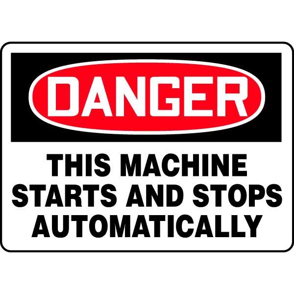Danger Sign, Sign Subject Matter Machine and Operational, Height 10 In., Width 14 In., Sign Material Plastic, Sign Mounting Style With Mounting Holes, Header Danger, Legend This Machine Starts And Stops Automatically, Printed Language English, Sign Shape Rectangle