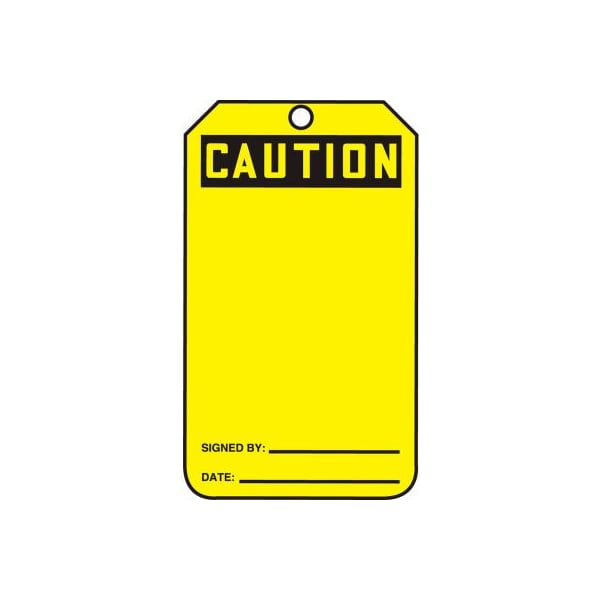 Safety tags, caution (blank), 25/pk, rp-plastic, 3-1/4"w x 5-3/4"h features: safety tags are to identify temporary hazard until that hazard is eliminated or hazardous operation is complete. comply in accordance with osha 29 cfr 1910.145 and ansi z535 requirements strong and durable, flexible 15-mil thick plastic is for industrial environments resists chemicals, tears, and abrasions, plus withstands dirt and grease writable surface is mar-resistant 3/8" top hole with reinforced brass grommet to prevent pull off up to 50-lb strength 25 per pack.