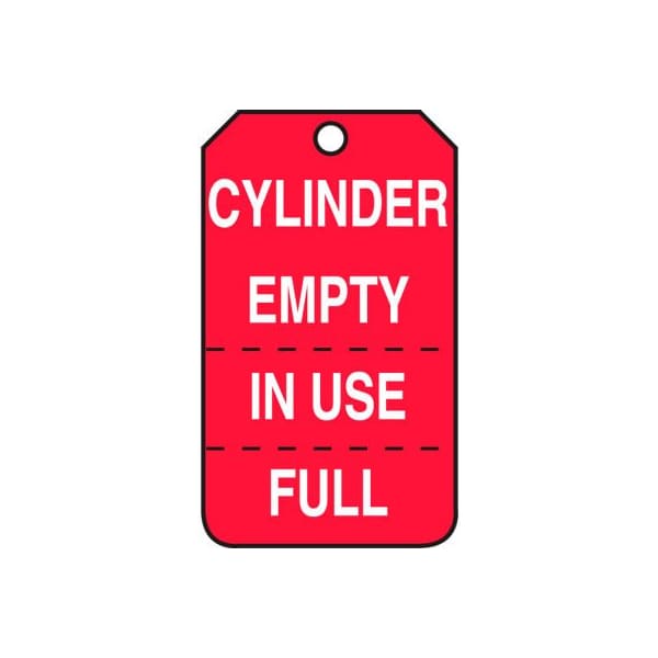 Safety tags, cylndr empty in use full (perf), 25/pk, rp-plastic, 5 3/4" x 3 1/4" features: safety tags are to identify temporary hazard until that hazard is eliminated or hazardous operation is complete. comply in accordance with osha 29 cfr 1910.145 and ansi z535 requirements strong and durable, flexible 15-mil thick plastic is for industrial environments resists chemicals, tears, and abrasions, plus withstands dirt and grease writable surface is mar-resistant 3/8" top hole with reinforced brass grommet to prevent pull off up to 50-lb strength 25 per pack.
