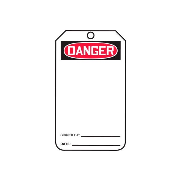 Safety tags, danger (blank), 25/pk, rp-plastic, 3-1/4"w x 5-3/4"h features: safety tags are to identify temporary hazard until that hazard is eliminated or hazardous operation is complete. comply in accordance with osha 29 cfr 1910.145 and ansi z535 requirements strong and durable, flexible 15-mil thick plastic is for industrial environments resists chemicals, tears, and abrasions, plus withstands dirt and grease writable surface is mar-resistant 3/8" top hole with reinforced brass grommet to prevent pull off up to 50-lb strength 25 per pack.